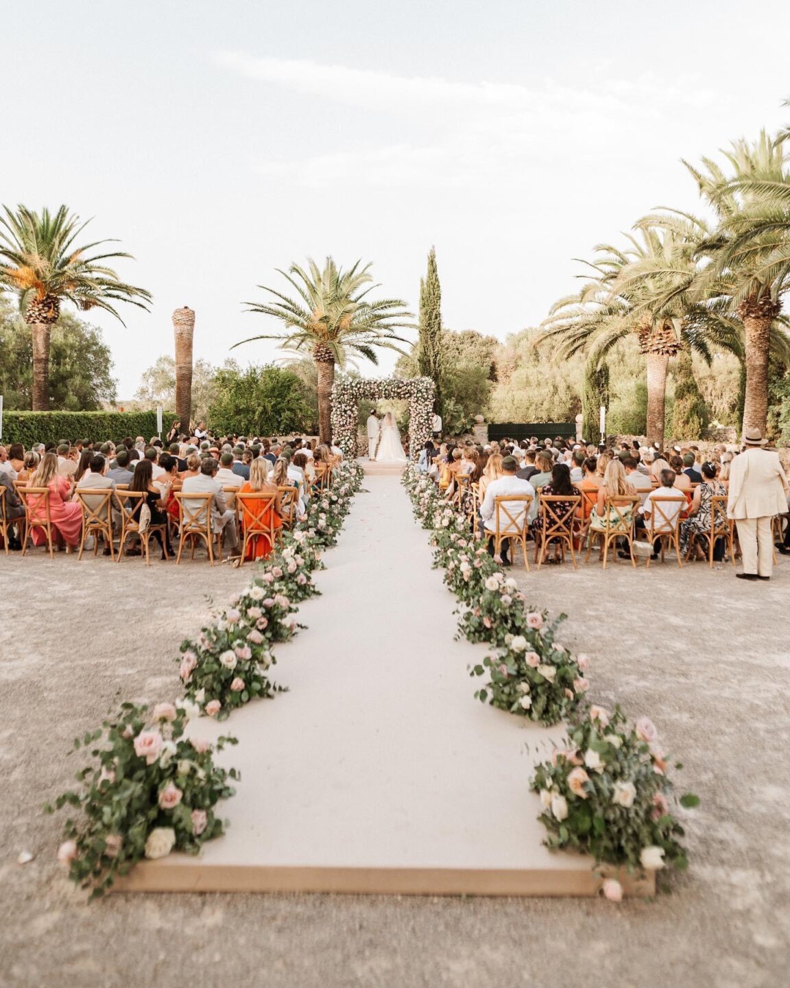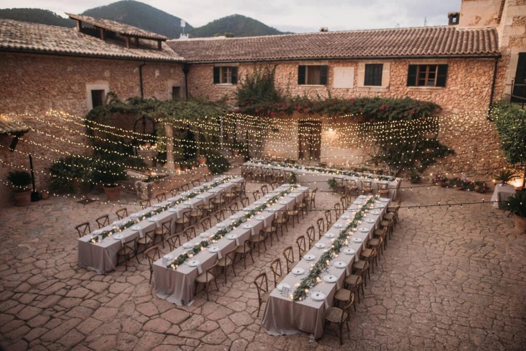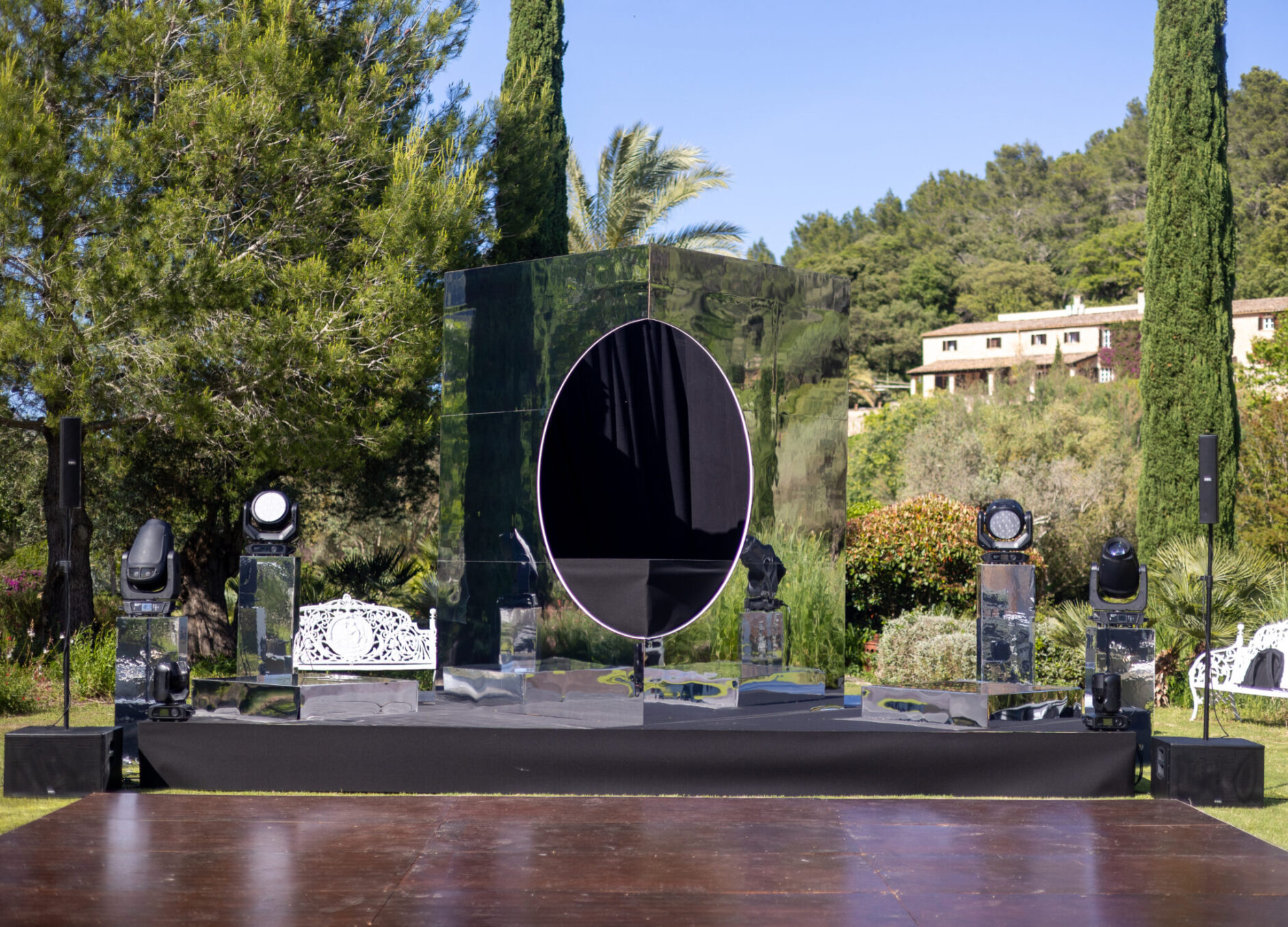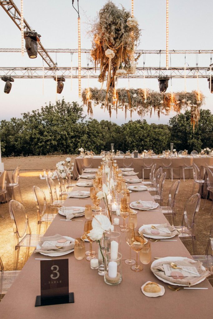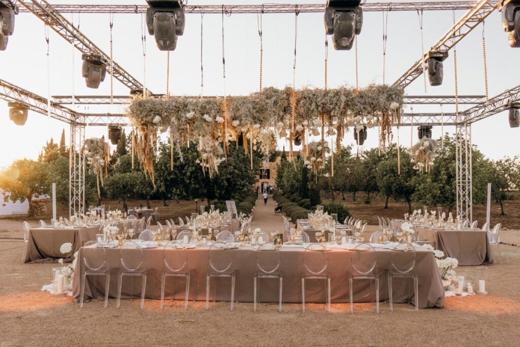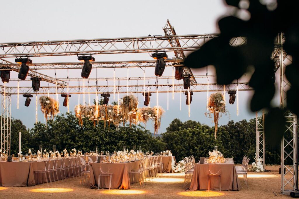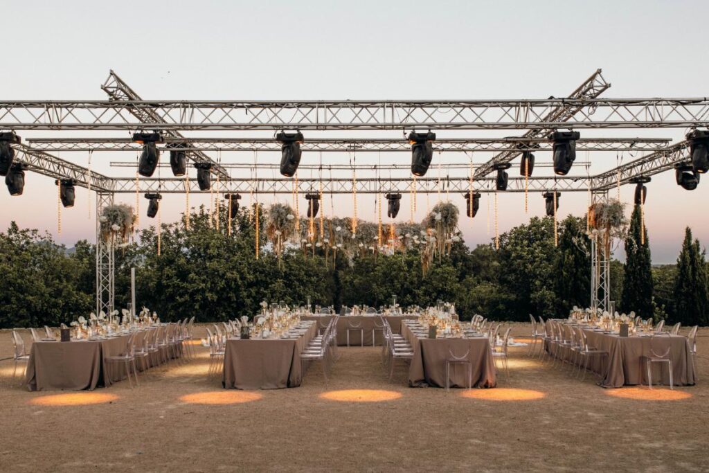 Un montaje único que combina glamour y esencia rústica, realizado en colaboración con la Wedding Planner Mille Papillons. Diseñamos una estructura suspendida para la iluminación y la decoración floral, creando un marco escénico que realzaba las mesas de la recepción e integraba el montaje con el paisaje. Además, ideamos la pista de baile, el set para los músicos y el DJ, y un túnel de luz que marcaba la entrada de los novios, aportando un toque mágico al inicio de la celebración.